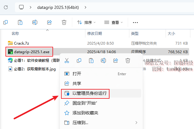 打开解压后的文件夹,右键程序【datagrip-2025.1】,点击【以管理员身份运行】。