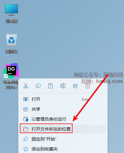 在桌面,右键软件【DataGrip】,点击【打开文件所在的位置】。