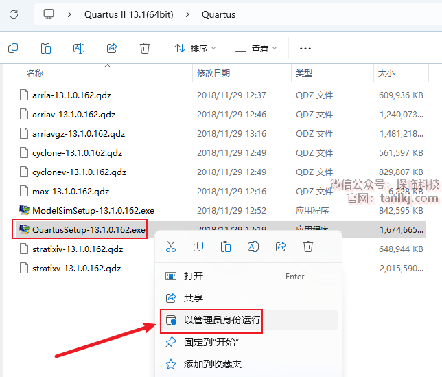 右键程序【QuartusSetup-13.1.0.162】,点击【以管理员身份运行】。