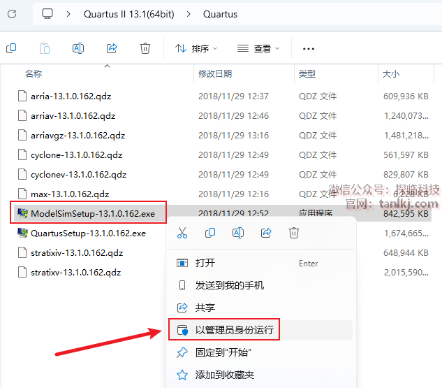 回到【Quartus】文件夹中,右键程序【ModelSimSetup-13.1.0.162】,点击【以管理员身份运行】。
