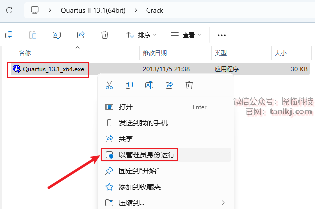 右键程序【Quartus_13.1_x64】,点击【以管理员身份运行】。