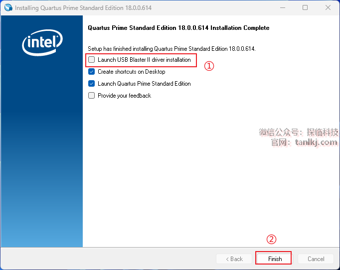 ①去掉勾选【Launch USB Blaster II driver installation 】;