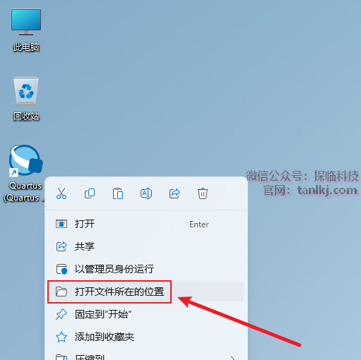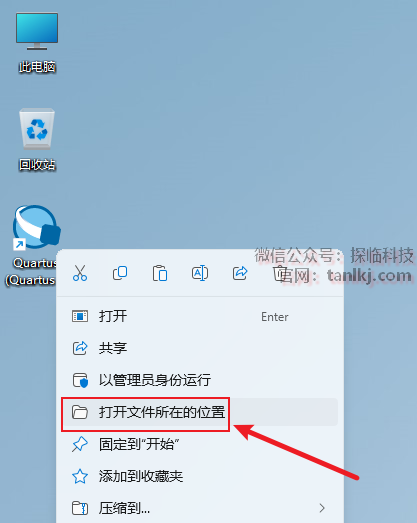 在桌面,右键软件【Quartus】,点击【打开文件所在的位置】。