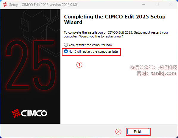 ①勾选【No,I will restart the computer later】;