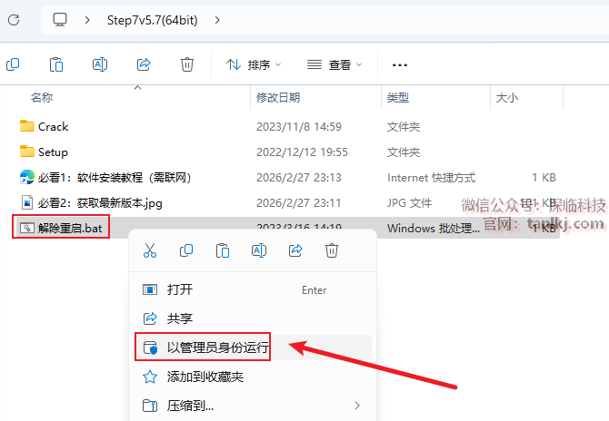 打开解压后的文件夹,右键程序【解除重启】,点击【以管理员身份运行】。(如没有任何反应,重启电脑后再继续下一步操作,如跳出黑色窗口,关掉即可)