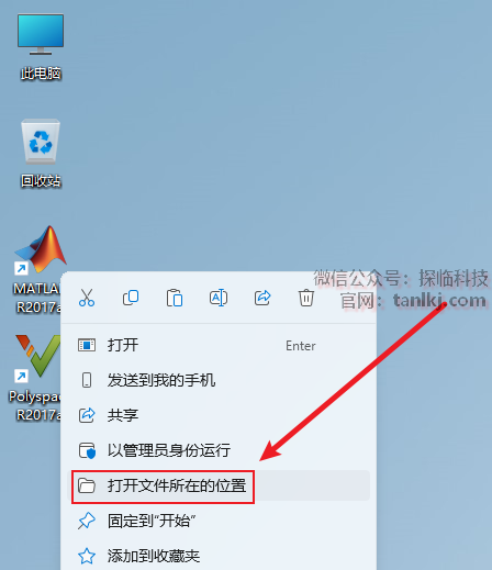 在桌面,右键软件【MATLAB R2017a】,点击【打开文件所在的位置】。