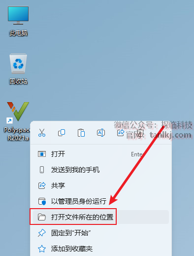 在桌面,右键软件【Polyspace R2021a】,点击【打开文件所在的位置】。