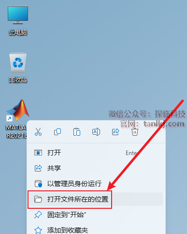 在桌面,右键软件【MATLAB R2021b】,点击【打开文件所在的位置】。