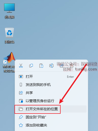 在桌面,右键软件【MATLAB R2023a】,点击【打开文件所在的位置】。