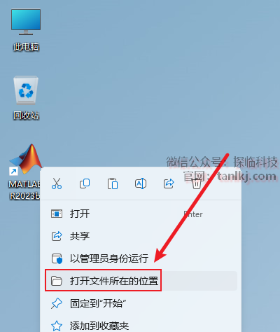 在桌面,右键软件【MATLAB R2023b】,点击【打开文件所在的位置】。