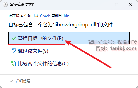 点击【替换目标中的文件】。