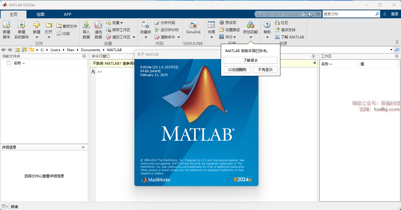 在桌面,双击运行软件【MATLAB R2024a】。