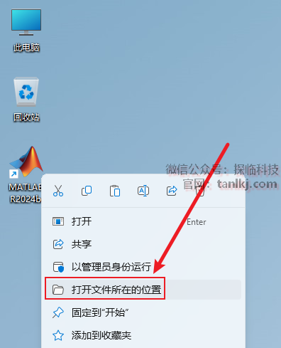 在桌面,右键软件【MATLAB R2024b】,点击【打开文件所在的位置】。