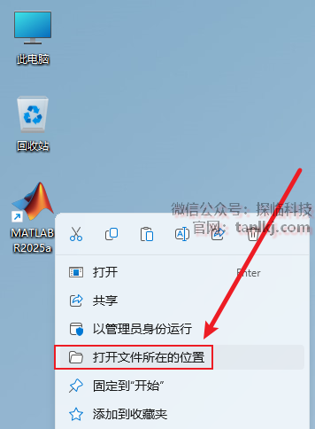 在桌面,右键软件【MATLAB R2025a】,点击【打开文件所在的位置】。