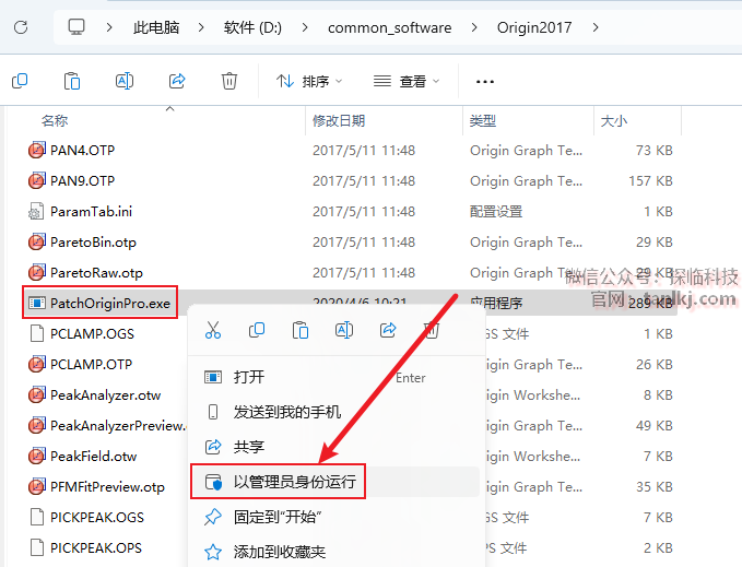 在当前窗口中,找到刚刚粘贴的文件【PatchOriginPro】,右键点击【以管理员身份运行】。
