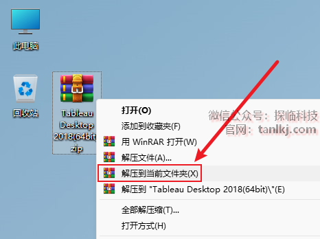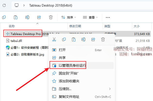 打开解压后的文件夹,右键程序【Tableau Desktop…】,点击【以管理员身份运行】。
