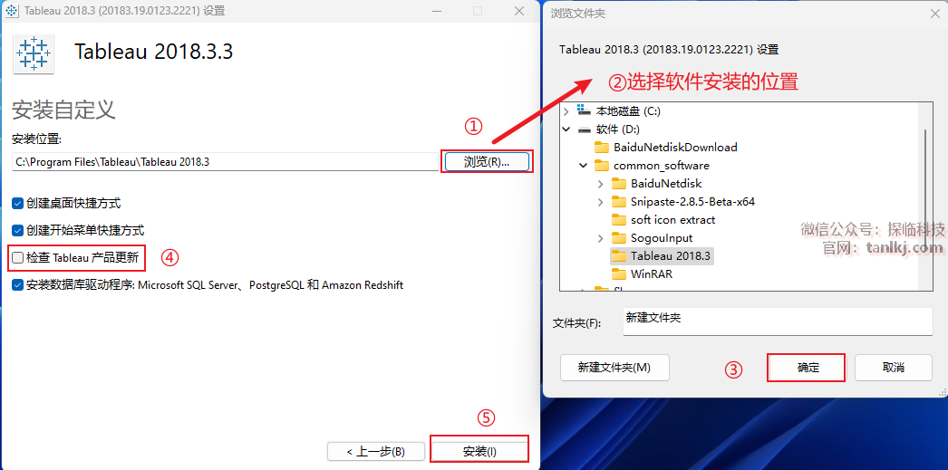 更改软件默认的安装位置,如不需更改,去掉勾选【检查Tableau产品更新】,直接点击【安装】。