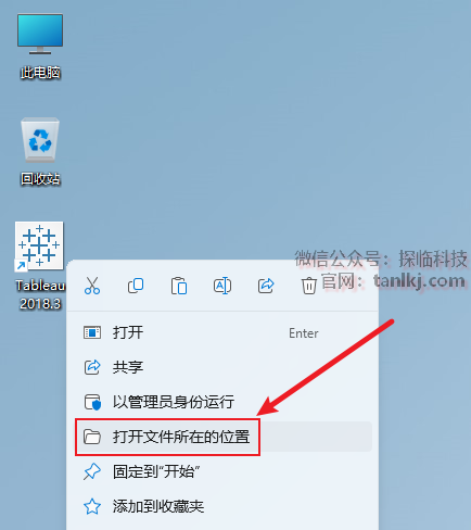 在桌面,右键软件【Tableau 2018.3】,点击【打开文件所在的位置】。