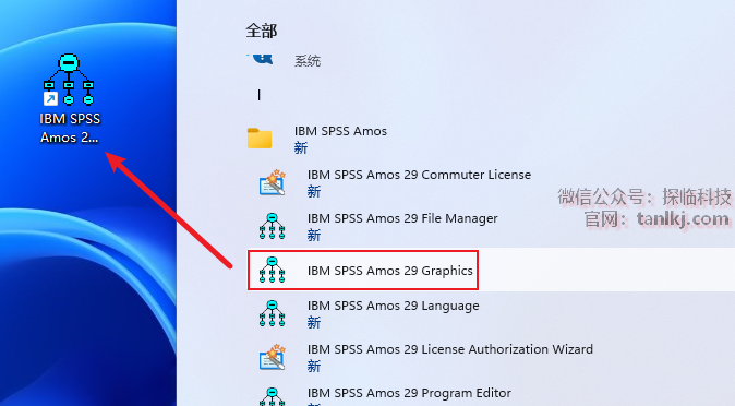 找到软件【IBM SPSS Amos 29 Graphics】,并将其拖至桌面创建快捷方式。