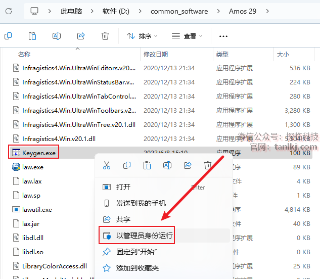 在当前文件夹内,找到刚刚粘贴的文件【Keygen】,右键点击【以管理员身份运行】。