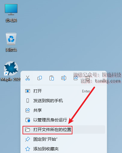 在桌面,右键软件【Maple 2020】,点击【打开文件所在的位置】。