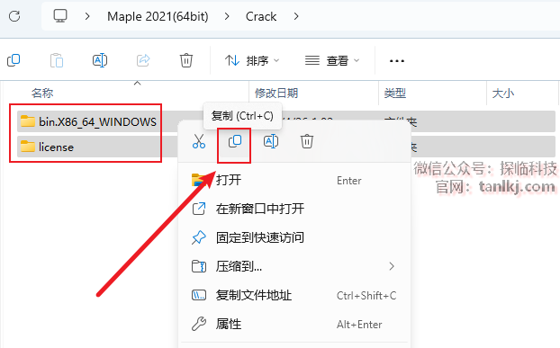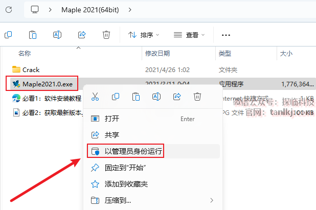 打开解压后的文件夹,右键程序【Maple2021.0…】,点击【以管理员身份运行】。