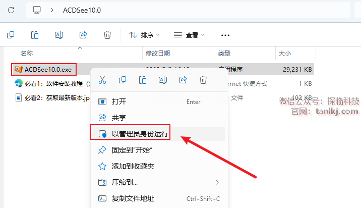 打开解压后的文件夹,右键安装程序【ACDSee10.0】,点击【以管理员身份运行】。