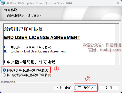 ①勾选【我接受该许可证协议中的条款】;