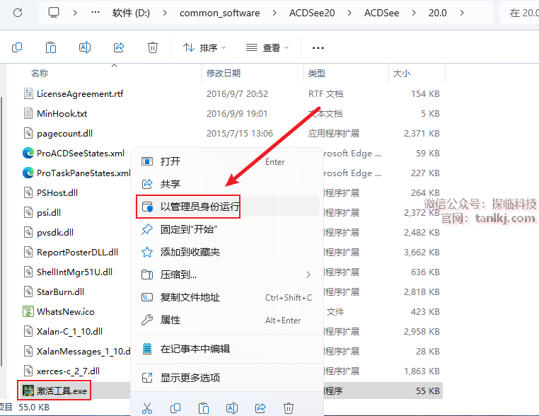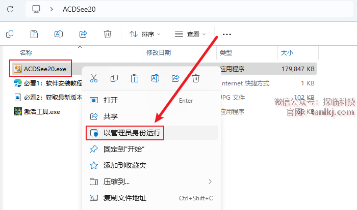 打开解压后的文件夹,右键安装程序【ACDSee20】,点击【以管理员身份运行】。