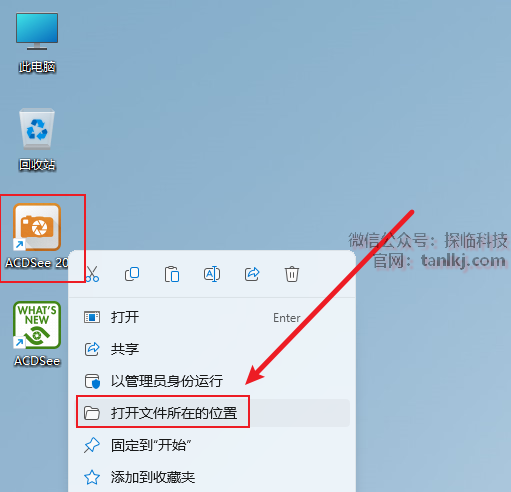 在桌面,右键软件【ACDSee 20】,点击【打开文件所在的位置】。