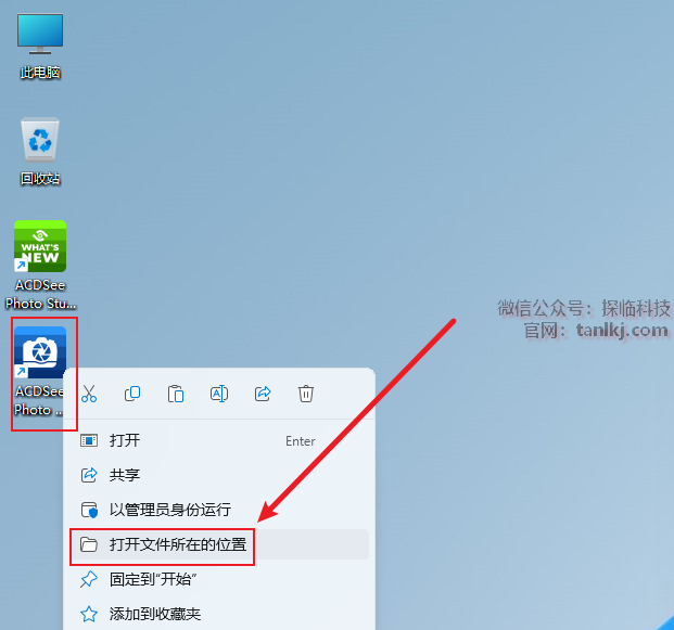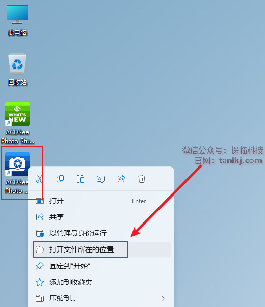 在桌面,右键软件【ACDSee Photo…】,点击【打开文件所在的位置】。