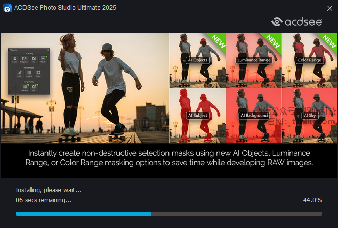 ACDSee 2025 深度融合新一代AI引擎与硬件加速技术,为专业摄影及创意设计提供全流程解决方案。其AI智能管理通过增强型人脸识别与语义分析自动标注关键词,结合智能相册动态归类海量图片;编辑层面升级实时AI选区(动态对象追踪/3D空间识别)与AI天空替换2.0(支持多光源环境融合),新增非破坏性AI降噪及超分辨率重构工具,RAW处理兼容700+相机型号并优化联机拍摄流程。工作流革新包括跨设备云协作(手机/平板实时同步编辑)、GPU强化批量处理(AI水印/自适应裁剪),集成区块链版权元数据嵌入及智能备份中心,结合可定制神经滤镜库与笔刷抖动校准,实现从数字资产管理到专业创作的端到端高效闭环。