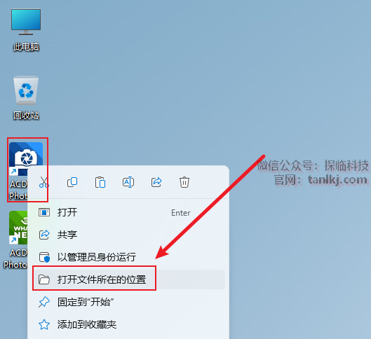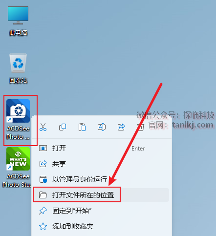 在桌面,右键软件【ACDSee Photo…】,点击【打开文件所在的位置】。