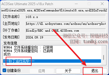 提示补丁运行完毕字样后,点击【退出】。