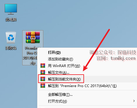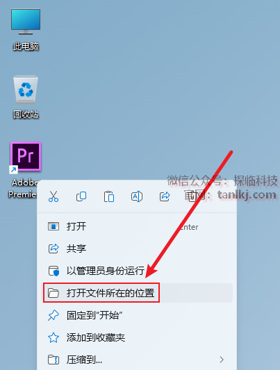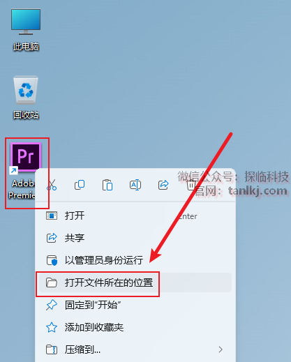 在桌面,右键软件【Adobe Premiere Pro CC 2017】,点击【打开文件所在的位置】。