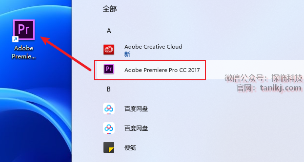 找到软件【Adobe Premiere Pro CC 2017】,将其拖至桌面创建快捷方式。