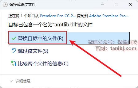 点击【替换目标中的文件】。