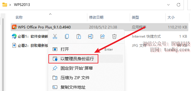 打开解压后的文件,右键程序【WPS Office Pro Plus…】,点击【以管理员身份运行】。