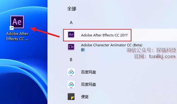 找到软件【Adobe After Effects CC 2017】,将其拖至桌面创建快捷方式。