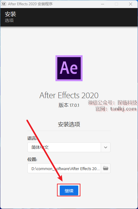 更改软件默认的安装位置,如不需更改,直接点击【继续】即可。