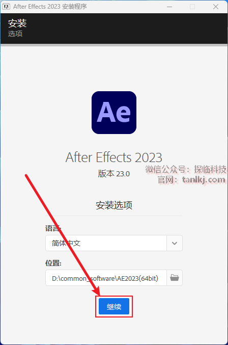 更改软件默认的安装位置,如不需更改,直接点击【继续】即可。