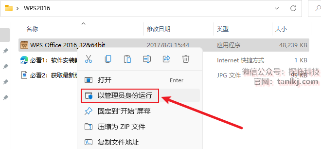 打开解压后的文件夹,右键程序【WPS Office 2016…】,点击【以管理员身份运行】。