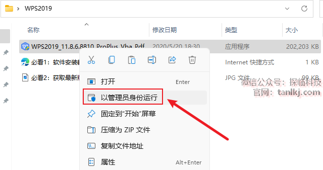 打开解压后的文件夹,右键程序【WPS2019…】,点击【以管理员身份运行】。