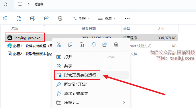 打开解压后的文件夹,右键程序【Jianying_pro】,点击【以管理员身份运行】。