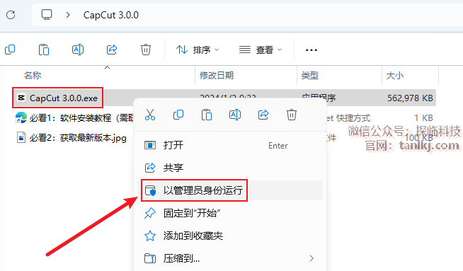 打开解压后的文件夹,右键程序【CapCut 3.0.0】,点击【以管理员身份运行】。