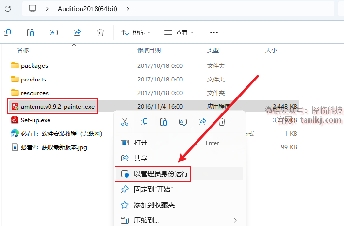 打开之前解压后的文件夹,右键程序【amtemu.v0.9.2】,点击【以管理员身份运行】(如若没有此文件,请关闭杀毒软件后重新解压)。