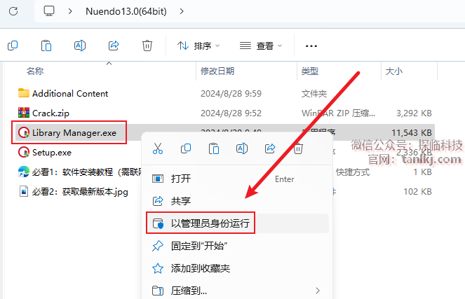 打开解压后的文件夹,右键程序【Library Manager】,点击【以管理员身份运行】。