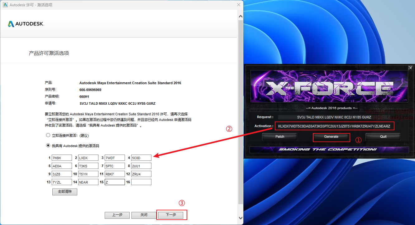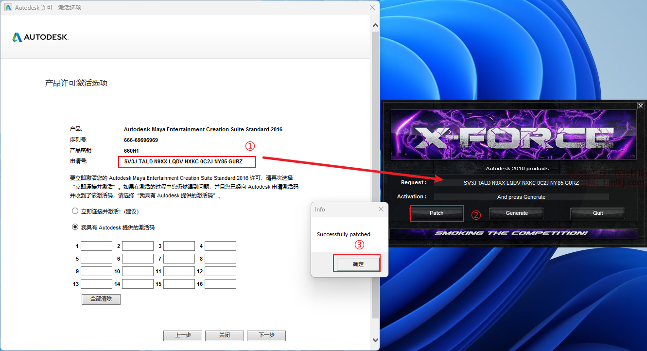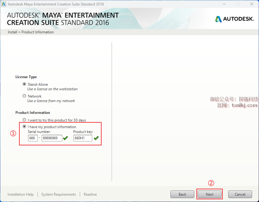 ①输入序列号和产品密钥: