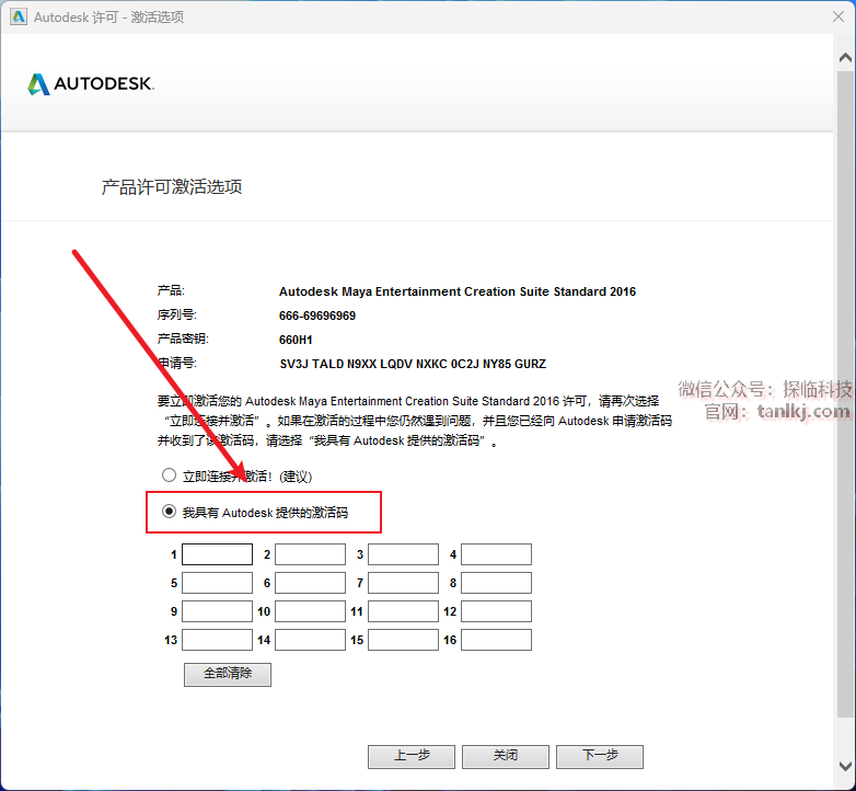 勾选【我具有Autodesk提供的激活码】。