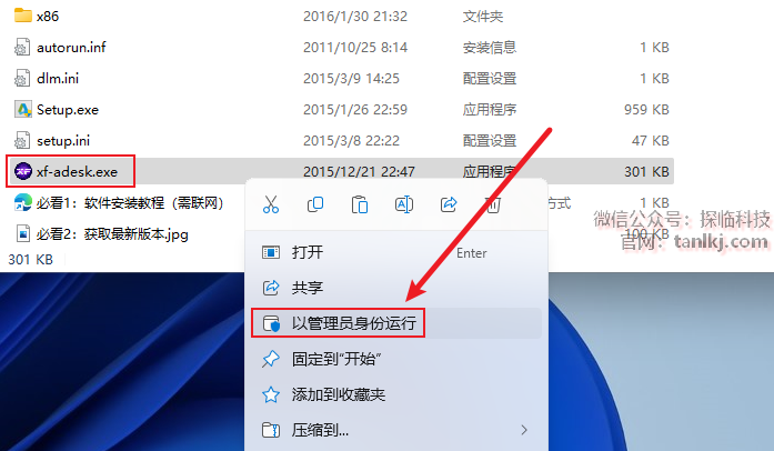 打开之前解压后的文件夹,右键程序【xf-adesk】,点击【以管理员身份运行】。